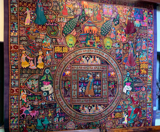Inspired by my travels to India. Colors, patterns, movement, and integration all fused together in a multi-layered assemblage. Four layers in total, and the piece is roughly 11 inches wide and 11 inches tall. It feels good to be back in my studio! :)